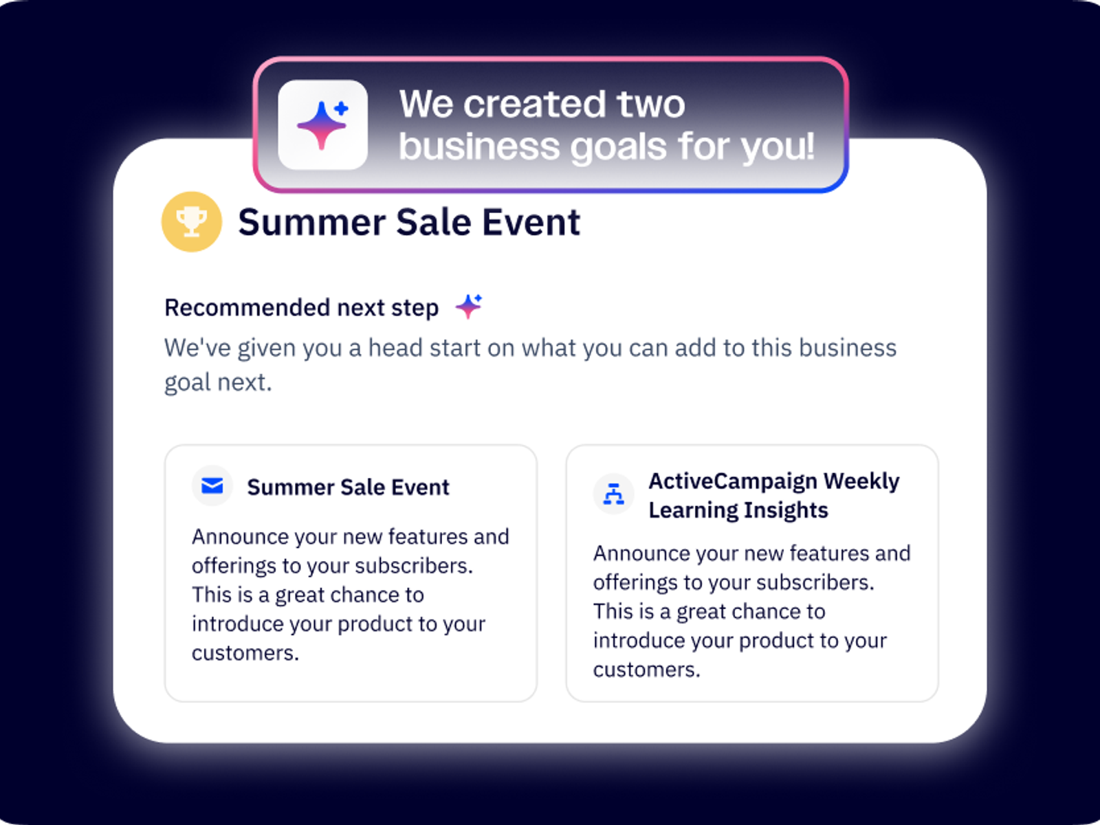 With integrated AI and machine learning, you get smart suggestions that point you in the right direction, help you generate on-brand content in seconds, and take your email and marketing initiatives to the next level by sending the right content to the right people–automatically.