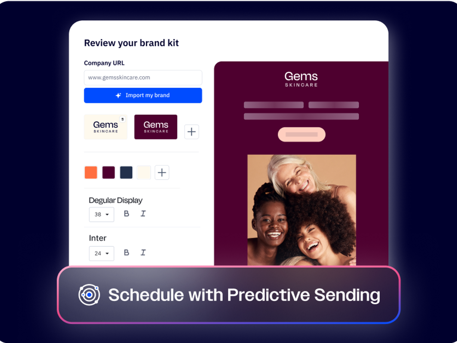 Skip the formatting and get right to sending. Import your brand identity from your website in seconds.