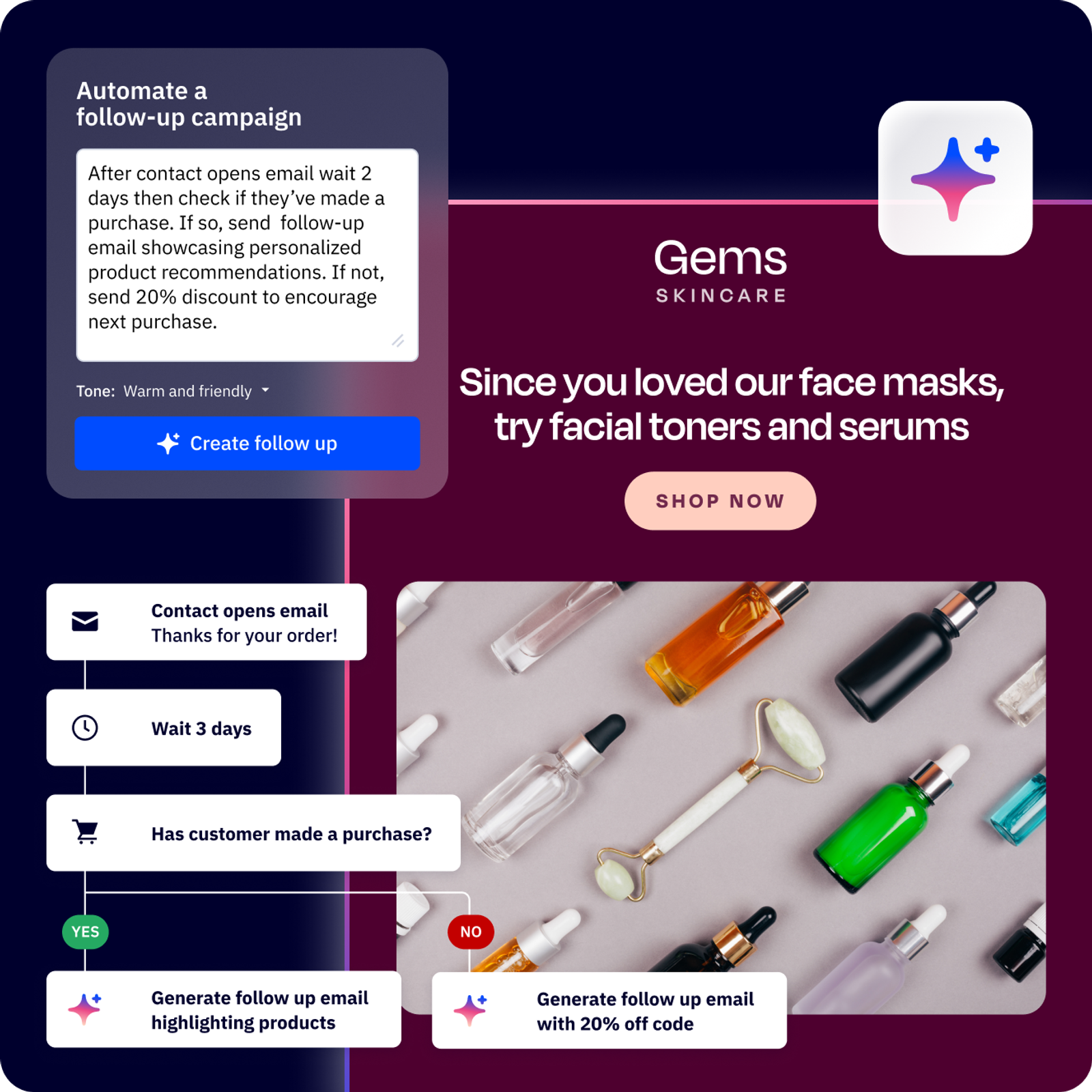 AI Campaign Builder gets your email campaign started in seconds—just type your goals and let AI create the layout, content, subject lines, and images. Easily test variations, swap CTAs or headlines, and explore new approaches without the heavy lifting.
