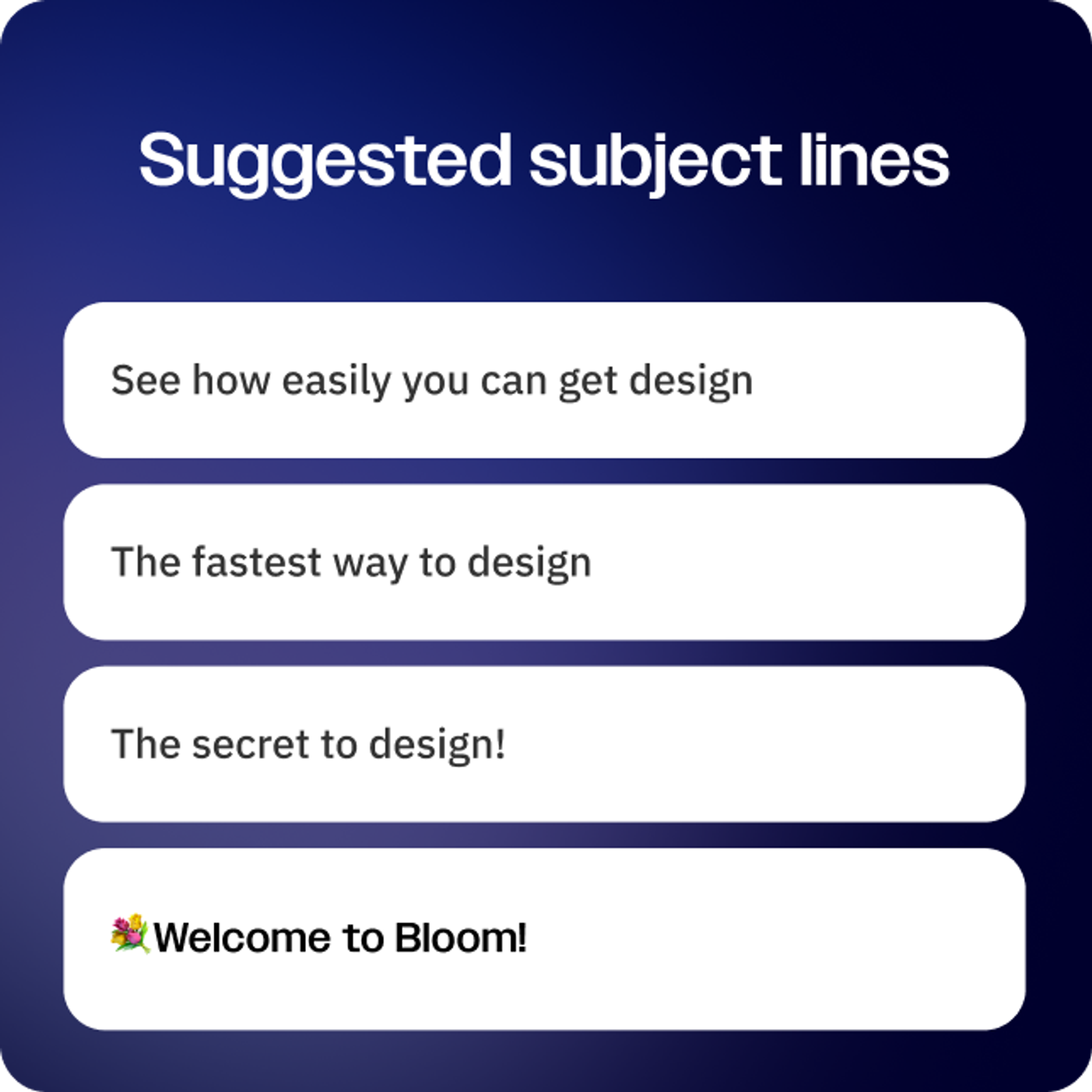 Great email subject lines get more people to pay attention to you. Let us give you some subject line ideas – or check out the guide to write your own.